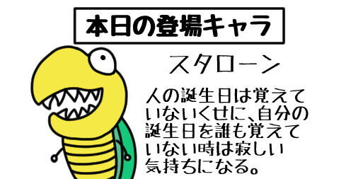 2021年04月03日 本日の登場キャラ いつか僕の漫画に登場する予定のキャラクターを紹介します。人の誕生日は覚えていないくせに、自分の誕生日を誰も覚えていない時は寂しい気持ちになる。 タグ :#ギャグ漫画#ギャグ#イラスト#絵描きさんと繋がりたい#お絵かき#イラスト好きな人と繋がりたい#誕生日#覚えてない#寂しい#スタローン